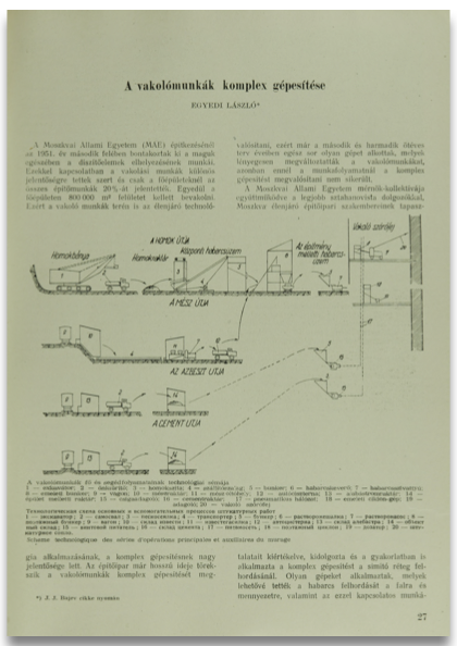 A Moszkvai Állami Egyetem (MAE) építkezésénél az 1951. év második felében bontakoztak ki a maguk egészében a díszítőelemek elhelyezésének munkái. Ezekkel kapcsolatban a vakolási munkák különös jelentőségre tettek szert és csak a főépületeknél az összes építőmunkák 20%-át jelentették. Egyedül a főépületen 800 0 0 0 m2 felületet kellett bevakolni. Ezért a vakoló munkák terén is az élenjáró technológia alkalmazásának, a komplex gépesítésnek nagy jelentősége lett. Az építőipar már hosszú ideje törek- szik a vakolómunkák komplex gépesítését megvalósítani, ezért már a második és harmadik ötéves terv éveiben egész sor olyan gépet alkottak, melyek lényegesen megváltoztatták a vakolómunkákat, azonban ennél a munkafolyamatnál a komplex gépesítést megvalósítani nem sikerült,